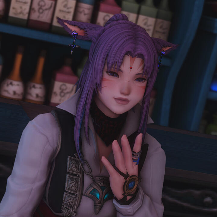 AppearanceRauni is a miqo'te woman of medium height and a runner's build, though there is a softness to her features as well. She has lavender eyes with the standard slitted pupils, and lavender hair with pale blue highlights. She has a few scars on the bridge of her nose and cheek. Her tail is slick and aerodynamic with a small lion-like tuft at the end.She is almost always seen wearing her old courier's hat, with which she seems especially attached.
