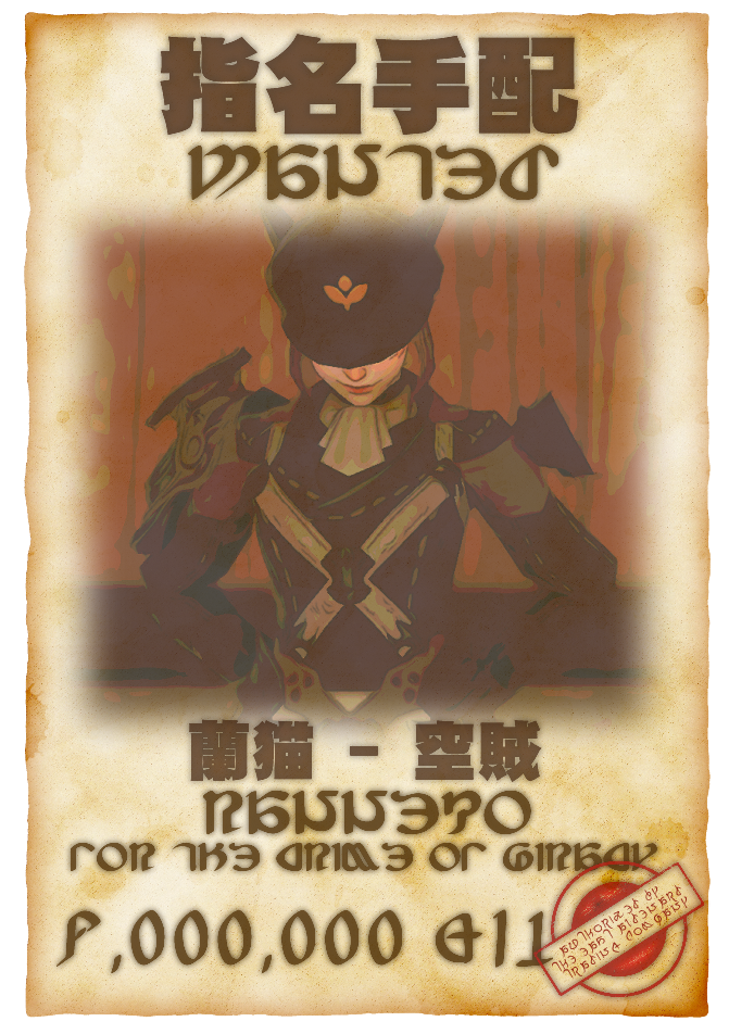 Whispers on the wind of the Far East say that the pirate Captain Ranneko has been making a name for herself in the Far Eastern skies, though no one ever seems to get the details lined up. Regardless, what is known about her is that - for an upstart pirate - she seems to have a stranglehold in a number of areas. People can't help but wonder if perhaps she has a more seasoned criminal in her pocket. More recently, she stole a ship and its cargo from the East Aldenard Trading Company, and there's a 4 million gil bounty on her head.